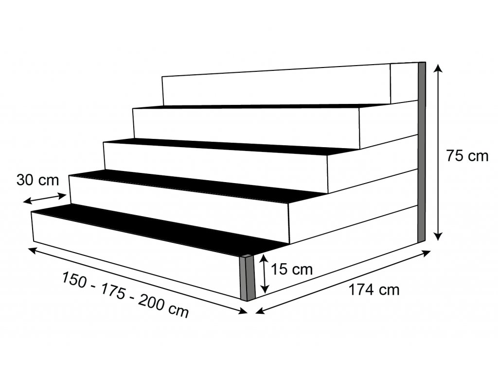Pôdorysné rozmery: šírka 150, 175 alebo 200 cm. 5 poschodia každé má 30 cm čistú vnútornú hĺbku, celková hĺbka záhona je 1174 cm.Výška zadnej steny (päť poschodia) je 75 cm a predná (jedno poschodie) je 15 cm.